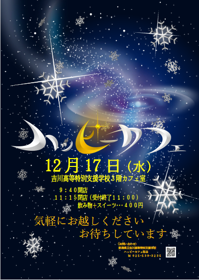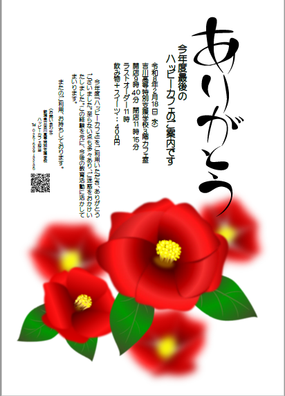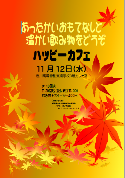 今年度のハッピーカフェは、@5月21日 A7月9日 B11月12日 C12月17日 D2月18日 の5回を予定しています。 また、営業時間は一年を通して9:40開店、 11:15閉店(受付終了11:00)に変更となりましたので、お知らせいたします。 〈10名以上(団体)でご来店されるお客様へ〉 →団体でのお客様用に、別日にご来店(特設カフェ)いただくこともできます。事前にお電話でご相談ください。 ◎カフェ室は3階です。スリッパが苦手なお客様には、別の履き物をご用意しております。お気軽にお使いください。 ※ご不明な点は、吉川高等特別支援学校 (025ー539-3235)・矢嶋へお問い合わせください。 |
